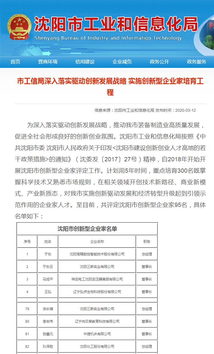 2020年03月12日,于東云董事長、洪長禧總經理被沈陽市經信委授予2019年度沈陽市創(chuàng)新型企業(yè)家稱號。這是對我公司一直以來實施創(chuàng)新戰(zhàn)略成果的肯定,也是對于總和洪總領導下以設計研發(fā)人員和技術人員為代表的全體員工創(chuàng)新精神的褒獎!