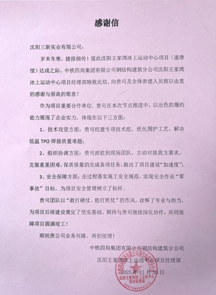 日前,中鐵四局項目部的感謝信跨越金秋而來,字里行間滿是對三新的敬意:“技術(shù)攻堅破局、組織協(xié)調(diào)高效、安全保障扎實,以‘三新力量’為場館如期封閉筑牢根基?!?/span>這紙贊譽(yù)背后,是汗水與堅守的沉淀,更是對東北建筑鐵軍匠心與實力的最佳詮釋。