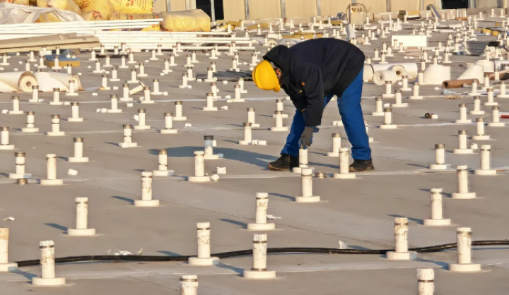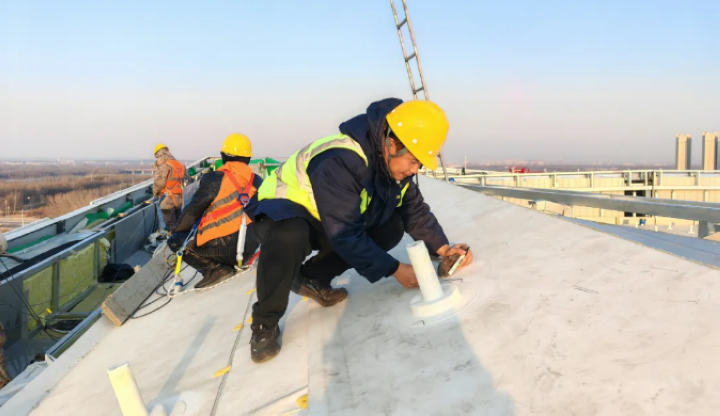 東北的冬季是最大考驗。三新專項技術(shù)組優(yōu)化圍護(hù)工藝,攻克低溫TPO 焊接難題;排水天溝內(nèi)置精準(zhǔn)電伴熱系統(tǒng),杜絕凍堵風(fēng)險;光伏支架立桿采用高分子包封件,實現(xiàn)防水與發(fā)電的無縫銜接。當(dāng)抗風(fēng)揭試驗室的模擬狂風(fēng)掠過屋面,這頂 “鳳冠” 用數(shù)據(jù)證明:它不僅是建筑的外衣,更是自然的摯友。