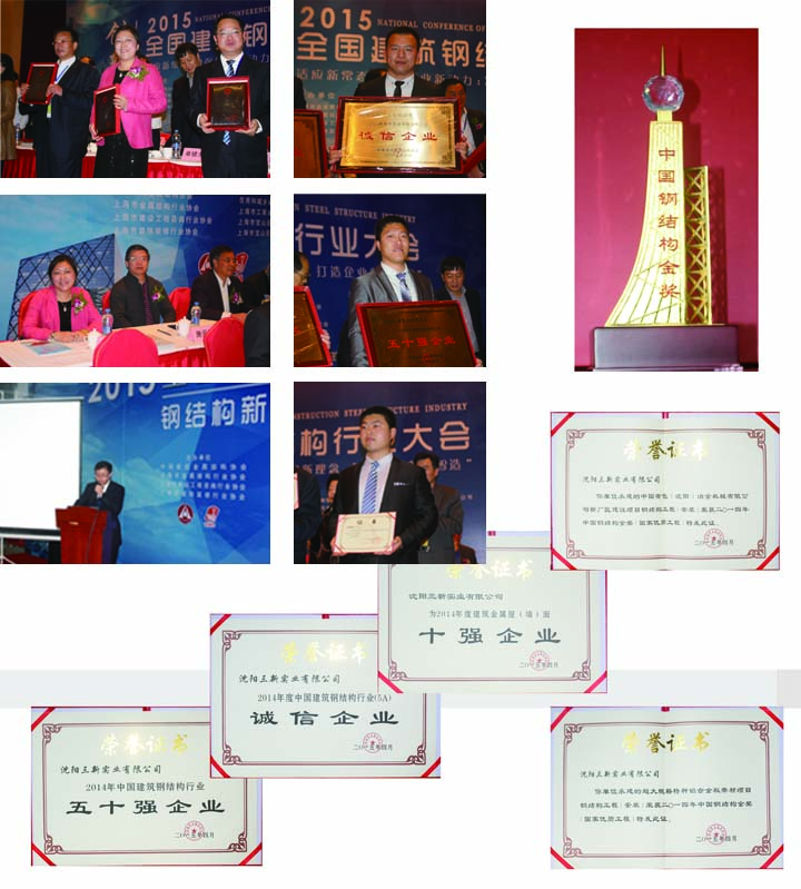本屆大會是表彰盛會,它被譽為鋼結(jié)構(gòu)行業(yè)的“東方奧斯卡盛典”共有十二個獎項在此頒發(fā)。三新集團董事長兼遼寧省建筑金屬結(jié)構(gòu)協(xié)會會長于東云率團參加了本次大會,并做了主旨演講。公司工程部高剛部長在“鋼結(jié)構(gòu)新技術(shù)、新產(chǎn)品交流會”上介紹并展示了公司的新技術(shù)新產(chǎn)品。公司承建的中國有色(沈陽)冶金機械新廠區(qū)建設(shè)項目、中鋁集團東北輕合金有限責(zé)任公司超大規(guī)模特種鋁合金板帶材項目及優(yōu)化特種鋁合金板帶材產(chǎn)品結(jié)構(gòu)配套項目分獲第十一屆第二批“中國鋼結(jié)構(gòu)金獎”。同時公司還獲得2014年度“中國建筑鋼結(jié)構(gòu)誠信企業(yè)(5A)”企業(yè)、“2014年度全國鋼結(jié)構(gòu)行業(yè)50強企業(yè)”、“2014年度金屬屋墻面行業(yè)十強企業(yè)” 稱號,于東云董事長榮獲“2014年度全國鋼結(jié)構(gòu)行業(yè)優(yōu)秀企業(yè)家” 稱號、王國臣榮獲 “2014年度全國鋼結(jié)構(gòu)行業(yè)優(yōu)秀車間主任”稱號、吳龍榮獲“2014年度行業(yè)協(xié)會優(yōu)秀工作者” 稱號。公司還派團參加了“2015年鋼結(jié)構(gòu)龍頭企業(yè)業(yè)績及配套產(chǎn)品展覽會”,公司及產(chǎn)品得到參會客商的良好評價。