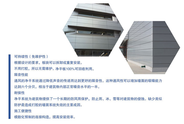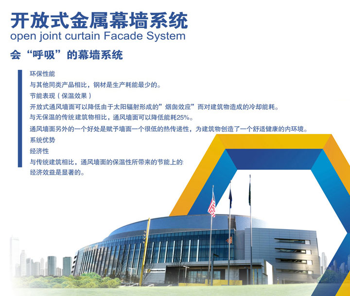 • 凈平開放式金屬幕墻系統(tǒng)----模數(shù)化的預制構造,使安裝更便捷,效率更高。